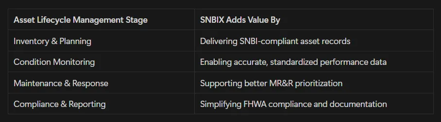 SNBIX™ adds value across various Asset Lifecycle Management stages, as detailed in the table below: