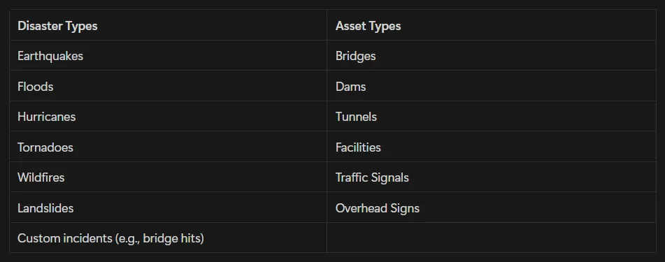 Artificial Intelligence and Field Tools to Strengthen Asset Lifecycle Management During Emergencies: Asset Intelligence-powered models predict disaster impacts like floods, helping identify at-risk assets and simulate scenarios. Teams can collaborate on custom models for better planning. Inspectors access asset data, capture offline inspections with photos and dictation, and navigate via GPS. The system integrates with inspectX™, AASHTO BrM, and connects to NOAA, USGS, USDA, and custom sensors for real-time monitoring.