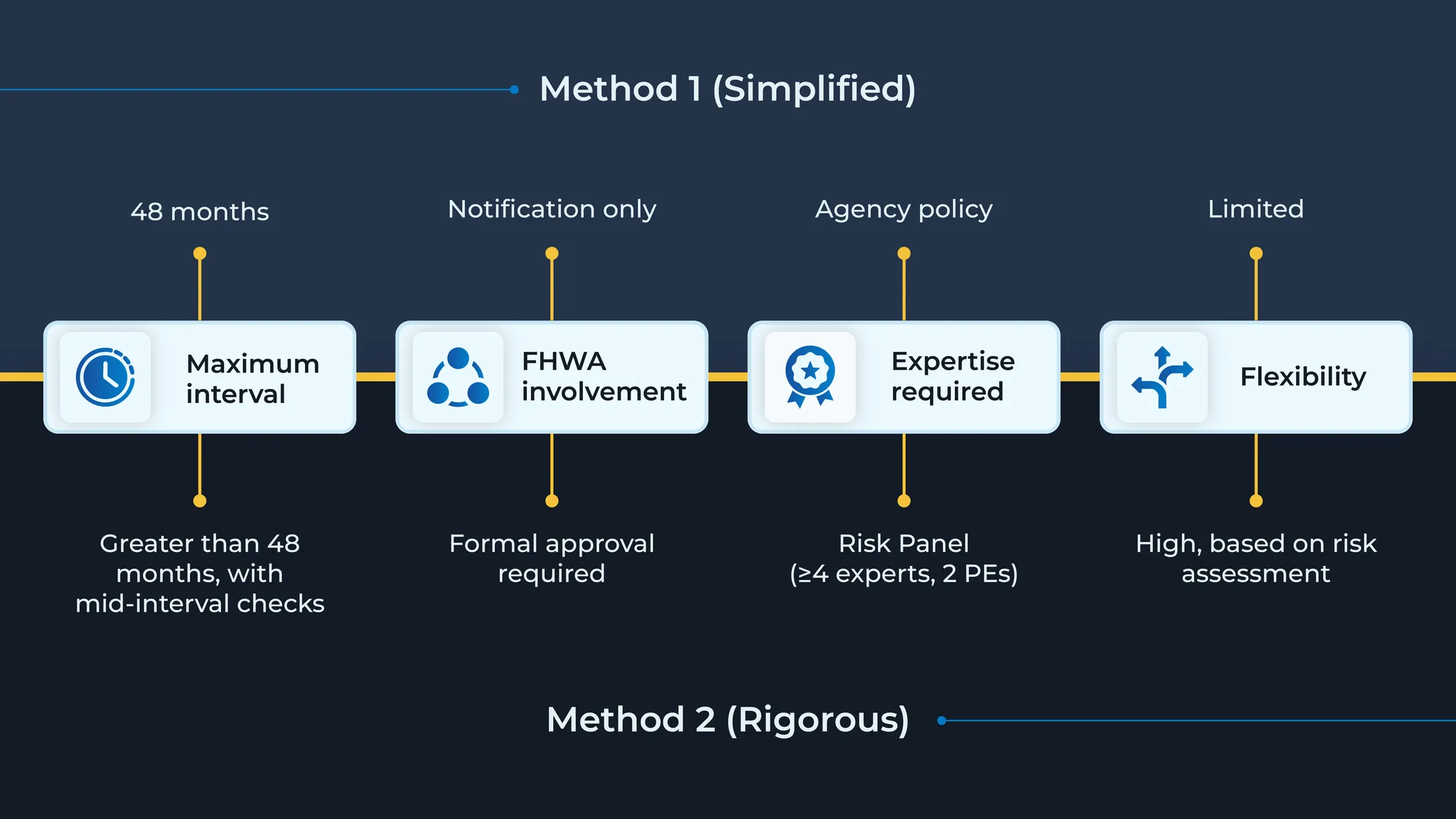 This approach allows agencies to adopt policy-based intervals, with a maximum NSTM inspection interval of 48 months. Implementation requires FHWA notification of the agency’s policy. This option is intended to provide predictable scheduling while enabling agencies to manage resources.