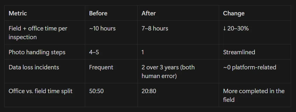 20% reduction in total inspection + documentation + QC time (based on internal time tracking: 10 hours down to 8 hours per inspection)