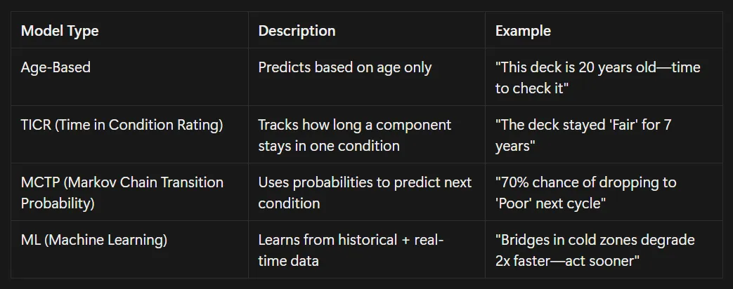 There’s no one-size-fits-all approach. Bridge deterioration models vary from basic rule-based systems to advanced data-driven methods, each designed to fit different asset types, data availability, and decision needs. Here's a quick look