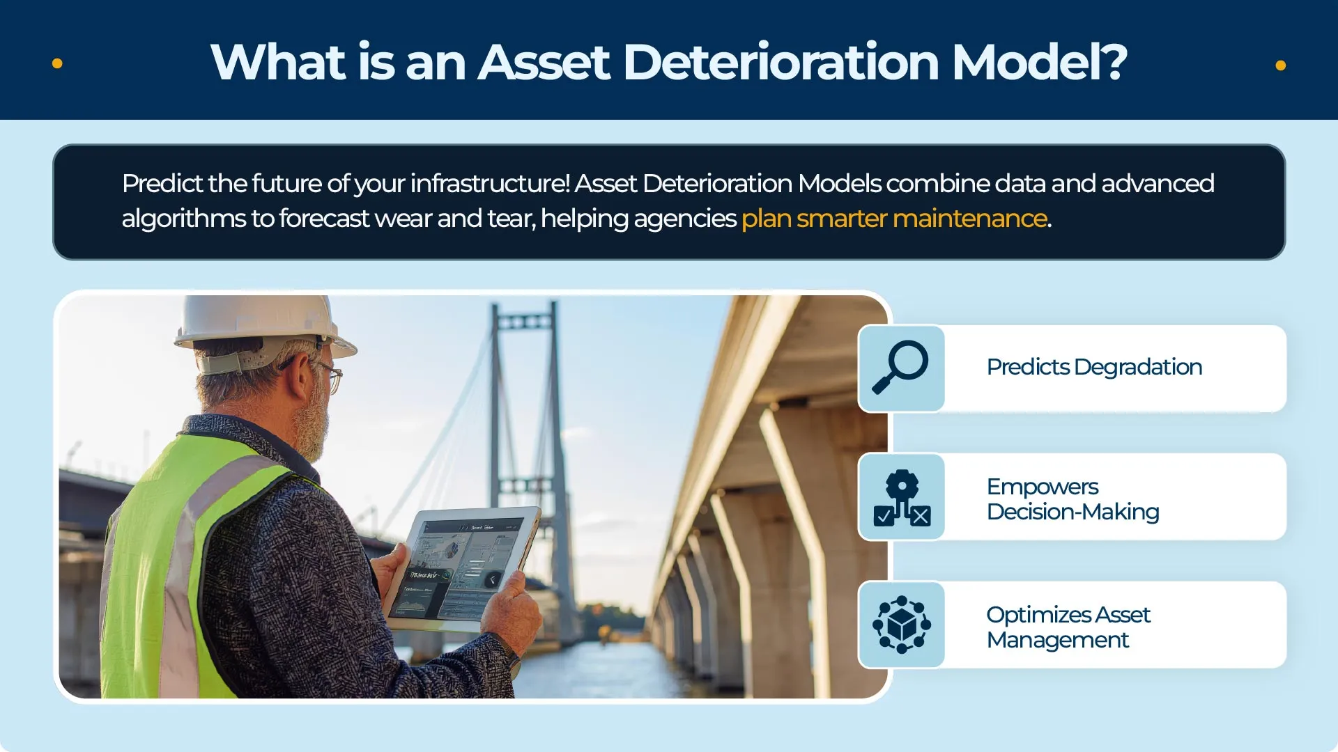 In short, data quality is the backbone of any effective asset deterioration model because reliable predictions start with reliable data. When your inputs are accurate and timely, your decisions become faster, bolder, and more cost-effective.