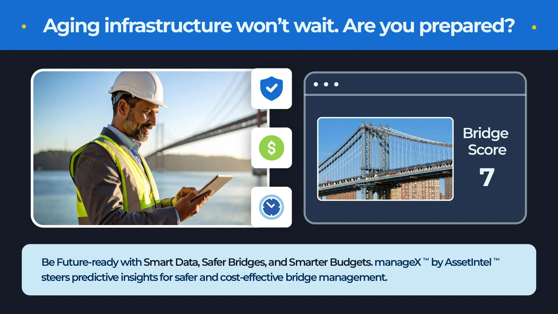 Predictive tools like manageX™ by AssetIntel™ transform inspection data into actionable insight and help agencies move from reactive fixes to proactive strategies, protecting lives, optimizing budgets, and extending the value of every structure.