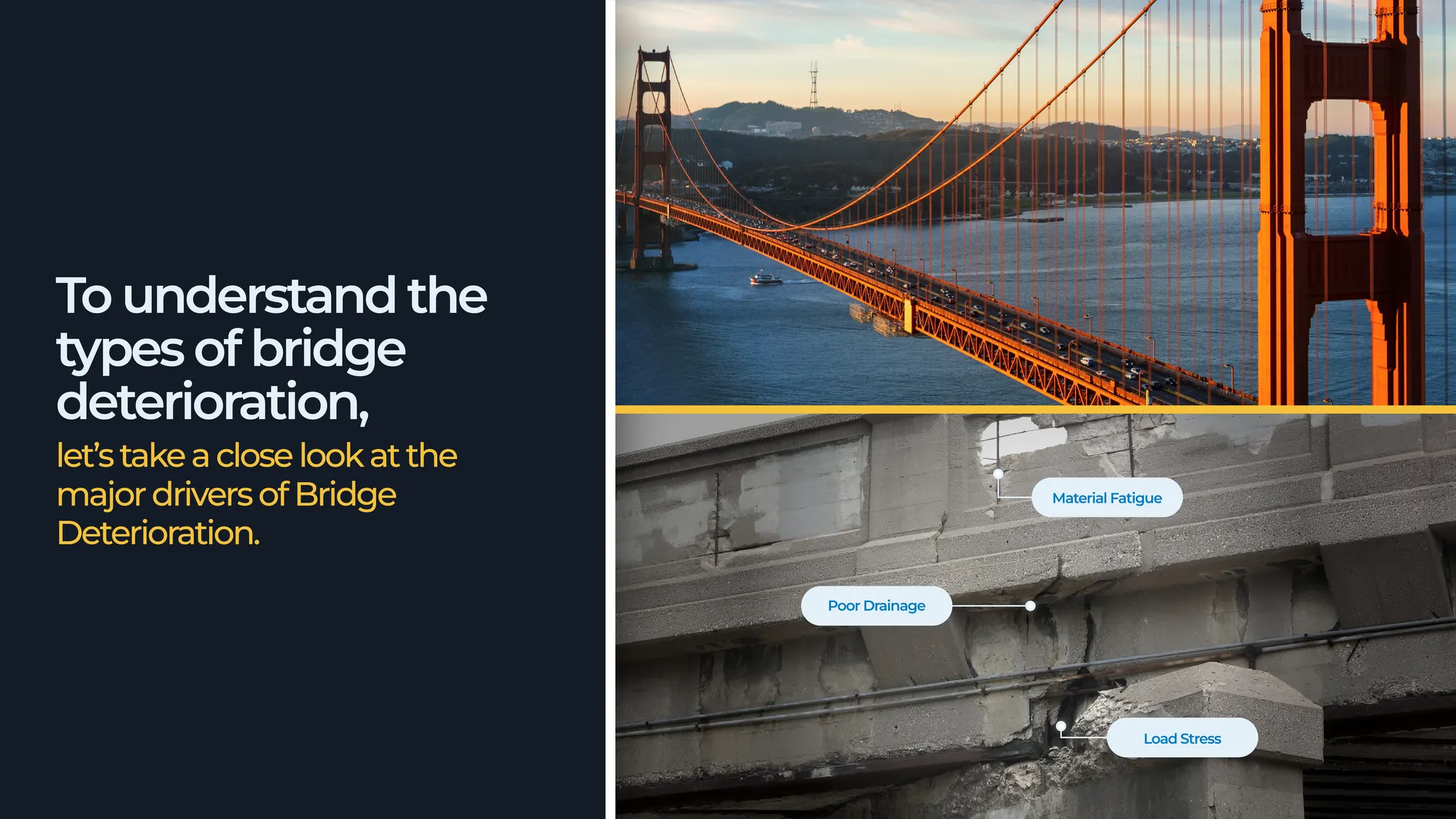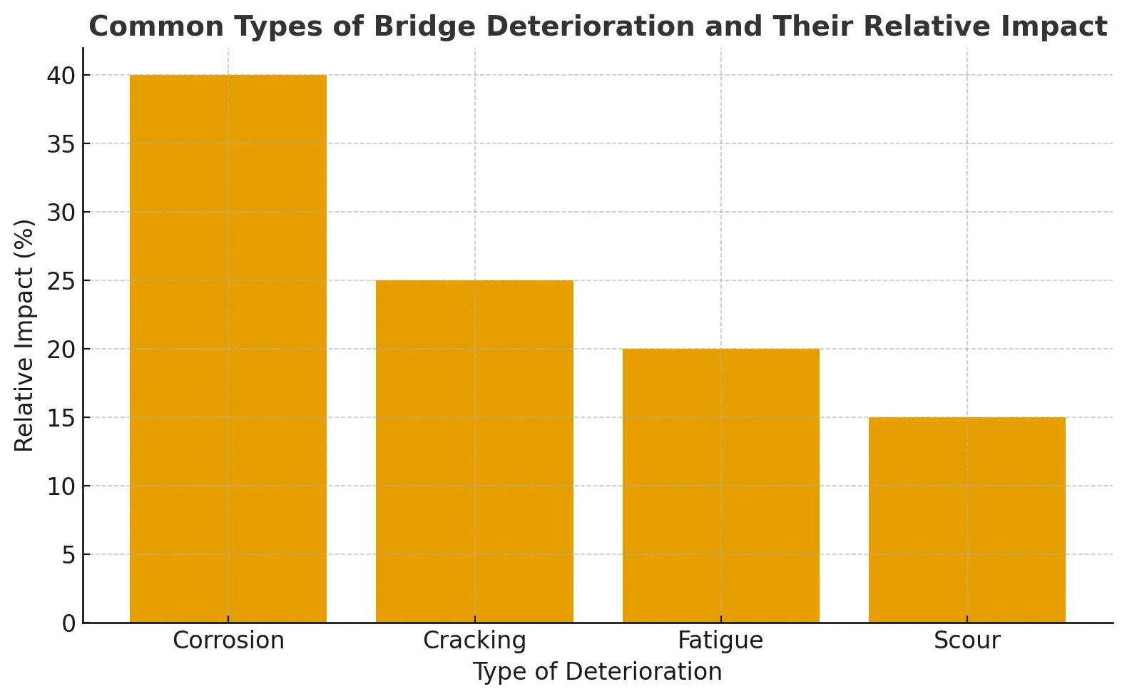Corrosion : It is a chemical reaction that happens between metal components and environmental elements. For the most part, corrosion leads to material degradation.Cracking : This type of bridge deterioration can develop due to stress, temperature changes, or material fatigue.Fatigue : Fatigue arises from repeated loading and unloading cycles. This type of bridge deterioration can weaken materials and result in failure over time.Scour : Bridge Scour stands for the erosion or removal of sediment, soil, or rock around bridge or culvert foundations or abutments. This is primarily caused by high water flow.These Deterioration Types Are Symptoms Of Deeper, Interrelated Factors That Govern How And When Bridges Degrade.