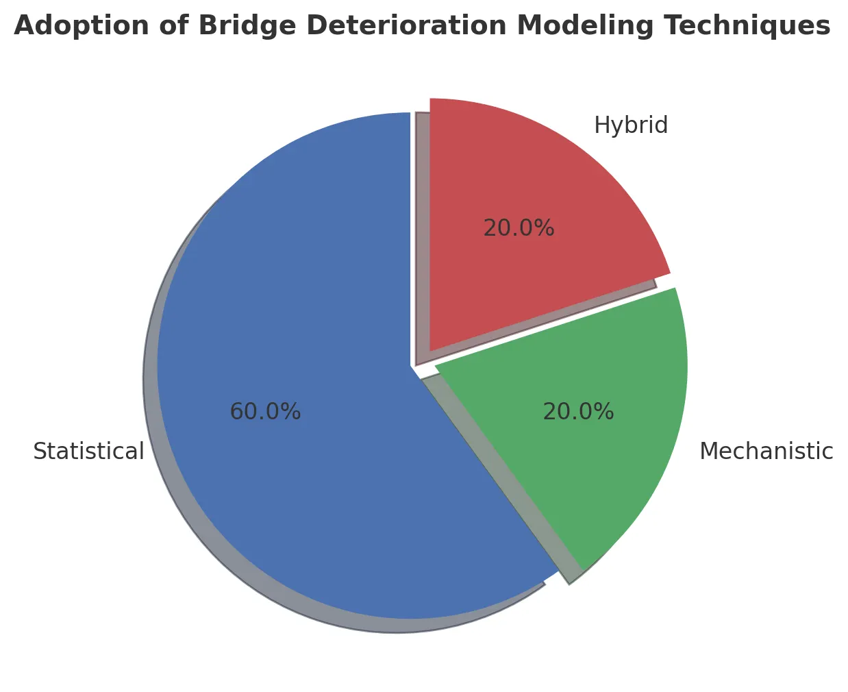 While various modeling techniques exist to simulate bridge deterioration, each offers unique advantages. For example, statistical bridge deterioration modeling uses historical data to forecast future deterioration based on observed trends. On the contrary, mechanistic bridge deterioration modeling focuses on the physical processes affecting materials. For the most part, it provides detailed insights into their behavior under stress.