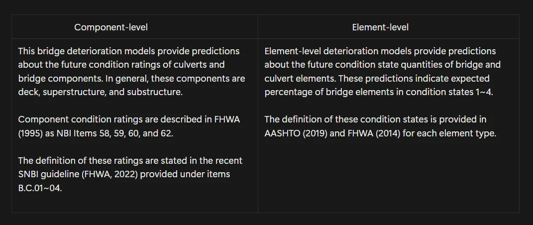 Significance of Bridge Deterioration Modeling Bridge deterioration models are models that help predict the condition of bridge members, either components or elements, over the course of time, if no condition-improving action is performed upon them. Notably, bridge deterioration models are an important part of a Bridge Management System (BMS). This is because bridge deterioration modeling provides predictions for the future condition of structures, based on which a Bridge Management System identifies optimal maintenance, repair, or rehabilitation actions, and helps conduct lifecycle planning.