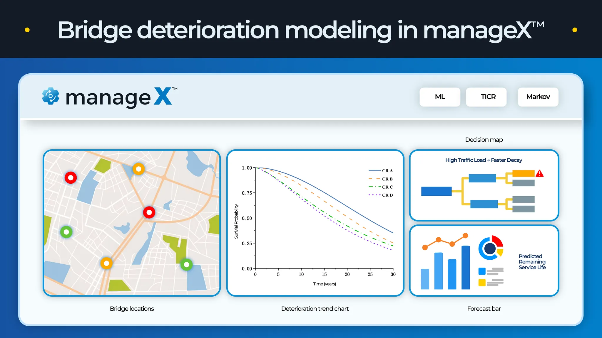 Bridge deterioration modeling in manageX™ Due to the large benefits of the Machine Learning bridge deterioration modeling method and practicality of the predictions provided through the TICR method, AssetIntel™ has developed an automatic Machine-Learning program that generates deterioration models for bridge components, in terms of Time-In-Condition-Rating.
