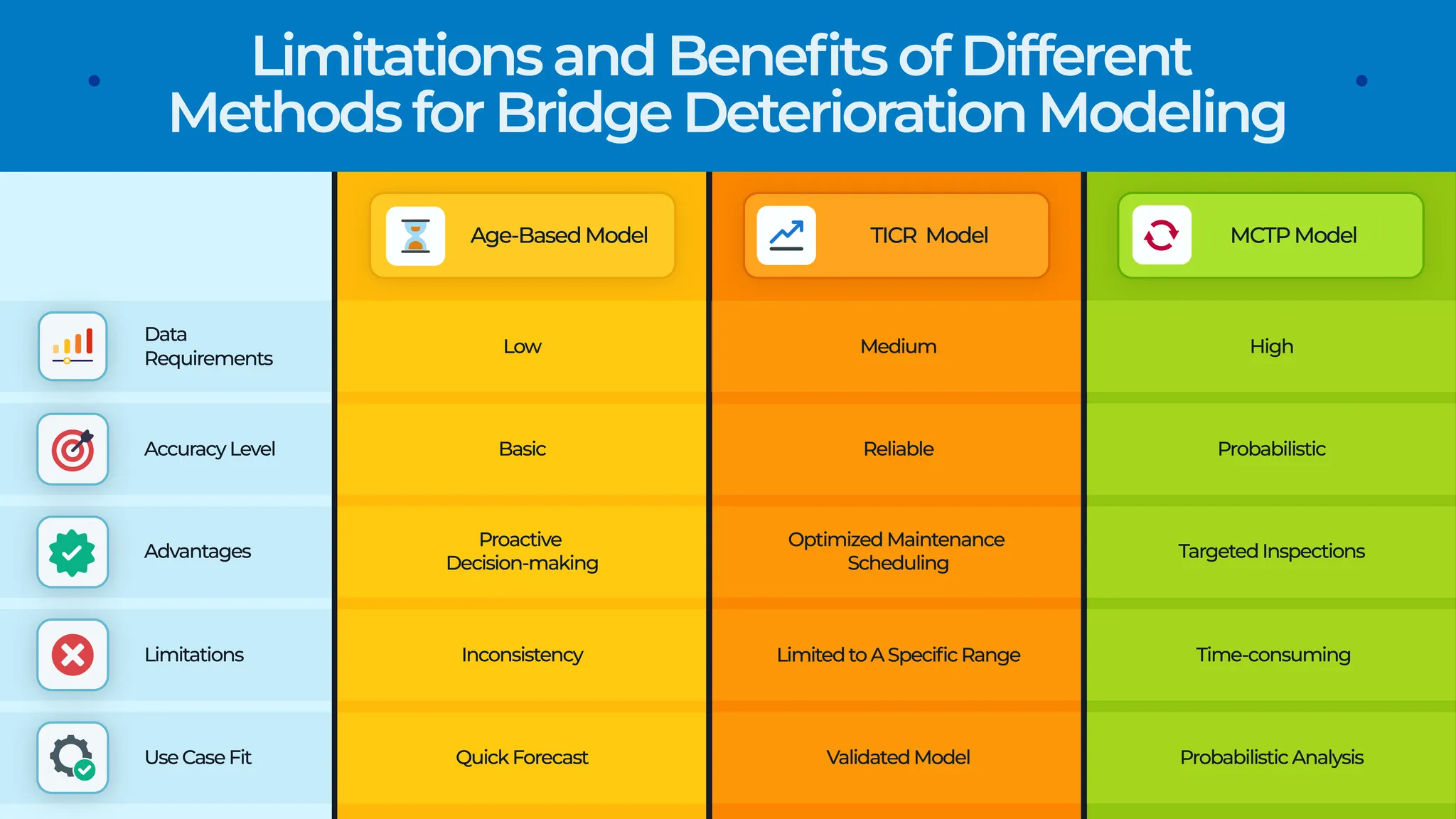 Age-Based Method : This method for developing a bridge deterioration model compares the ages of bridges in condition ratings to develop deterioration curves. In general, this method is more suitable for component-level bridge deterioration modeling.Time in Condition Rating (TICR) Method : Generally, this method helps measure how long bridge components remain in a specific condition rating before deteriorating. For the most part, it offers a direct evaluation of time spent in each condition.Markov Chain Transition Probability (MCTP) Method : This method for developing bridge deterioration modeling counts how many components or element quantities stay in the same condition over a fixed time frame. Later, these counts are converted into transition probabilities, which indicate how likely components are to shift between condition states over time, enabling more accurate forecasting and strategic maintenance planning.Machine Learning (ML) Method : This method leverages advanced Machine Learning algorithms to predict future bridge conditions with greater precision. Assessing historical inspection data and relevant influencing factors helps estimate the most likely condition state or the likelihood of being in different condition levels at the next inspection cycle, supporting data-driven maintenance and planning decisions.Several Established Methods Are Used To Model Bridge Deterioration, Each With Distinct Strengths And Limitations.